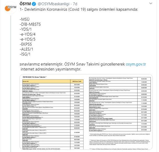 ÖSYM, koronavirüs salgınının ülkemizde yayılmasının önlenmesine yönelik alınan tedbirler kapsamında dokuz sınavın tarihini erteledi. 2020 ÖSYM Sınav Takvimi güncellenerek https://www.osym.gov.tr internet adresinden yayımlandı.Bu kapsamda: