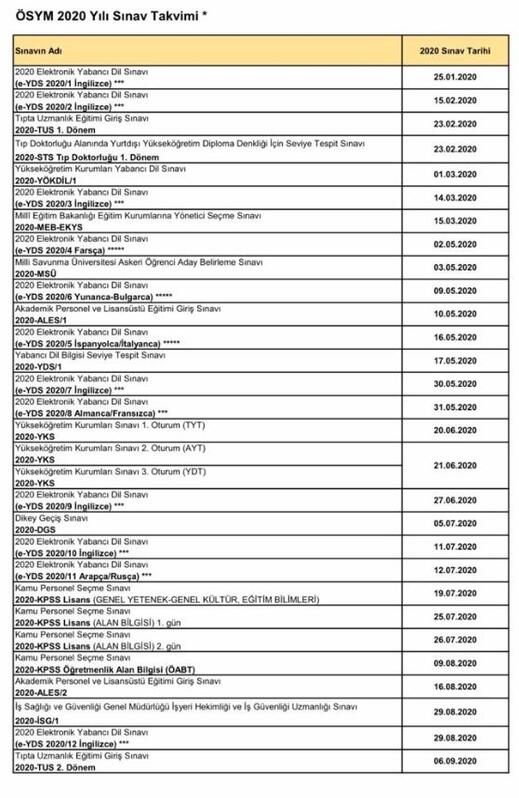 - 20 Eylül'de tarihinde yapılması planlanan 2020 Akademik Personel ve Lisansüstü Eğitimi Giriş Sınavı (2020-ALES/2) ise 16 Ağustos'a ertelendi.