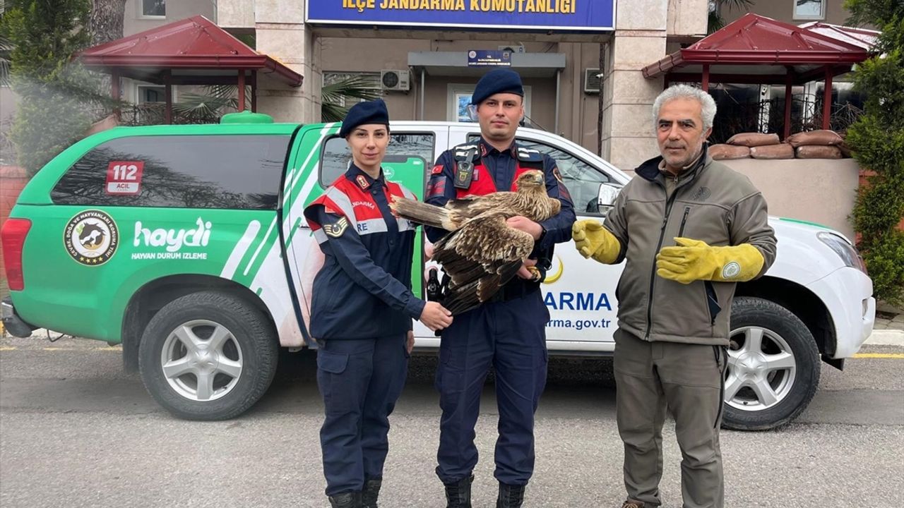 İlçe Jandarma Komutanlığı ekipleri Kabazlı Mahallesi'nde devriye görevi sırasında kanadı kırık ve bitkin halde kızıl şahin buldu.