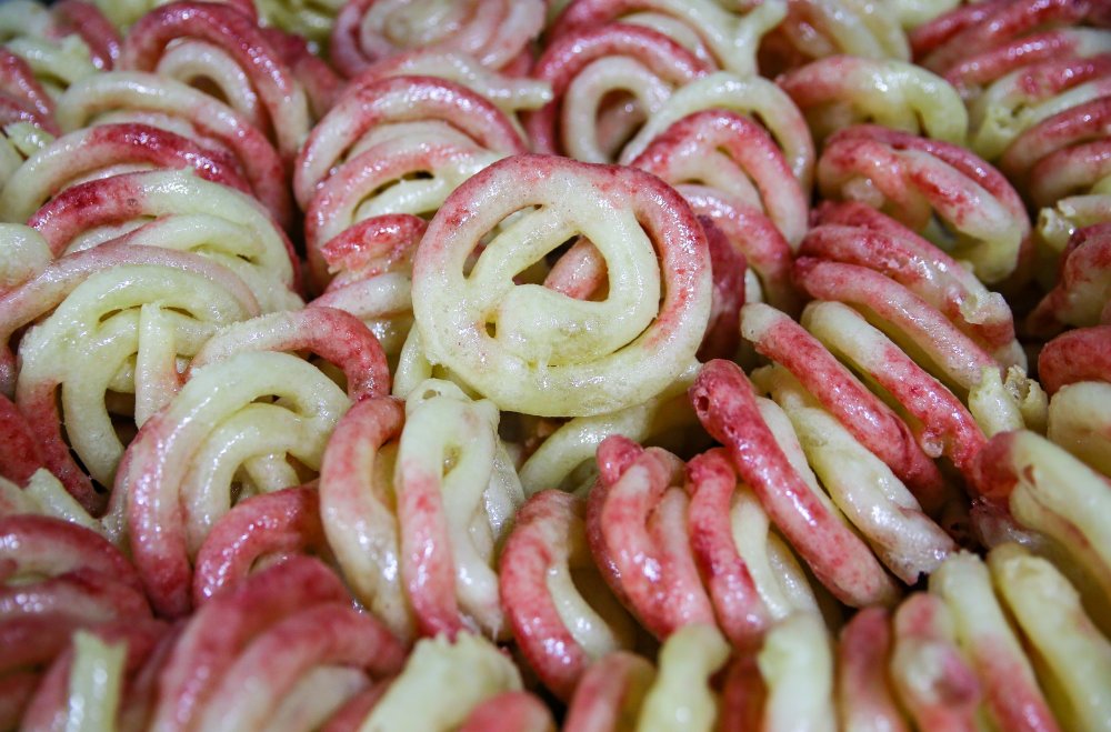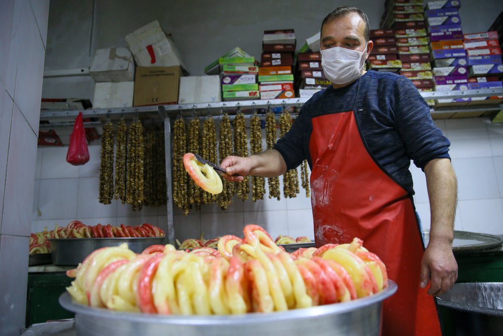 "Un, nişasta, şeker ve maya ile geceden hazırladığımız hamuru sahur vaktine kadar kabarması için kazanda bekletiyoruz. Daha sonra halka şeklinde biçim verilen hamurları kızgın yağda kızartıyoruz. Kızartma işlemi bittikten sonra bu halkalar demir bir çubuğa geçirilerek bitkisel boyanın içine atılıyor. Kırmızı bir renge kavuşan tatlıyı daha sonra şerbet kazanına atıp tüketime hazır hale getiriyoruz. Saat 04.00'te çalışmaya başlarız ve işimiz iftara kadar devam eder. Özellikle ramazanın ilk günleri olması dolayısıyla aşırı bir talep var. Farklı kentlerde yaşayan Bergamalılar da bu ürünü istiyor. Kargoyla onlara da göndermeye çalışıyoruz. Kilosu 30 liradan satılıyor."