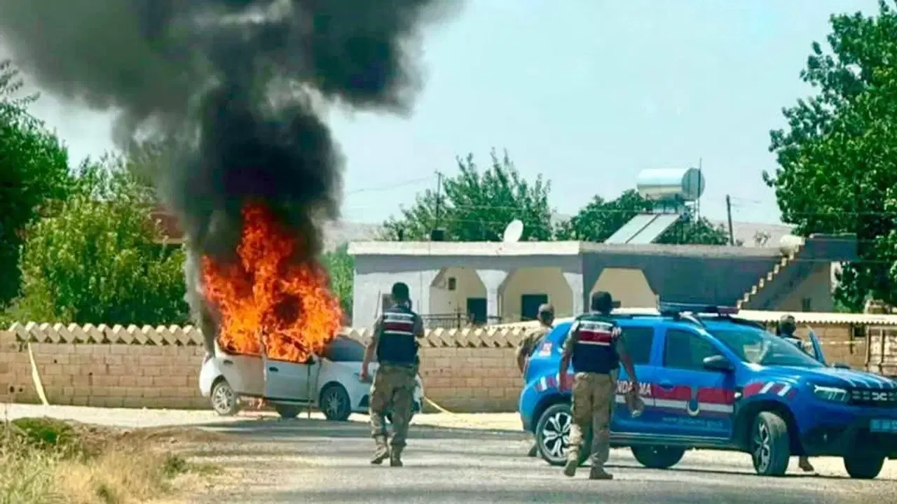 Taraflar birbirine taş ve sopalarla vururken bir kişi de aracı ateşe verdi.