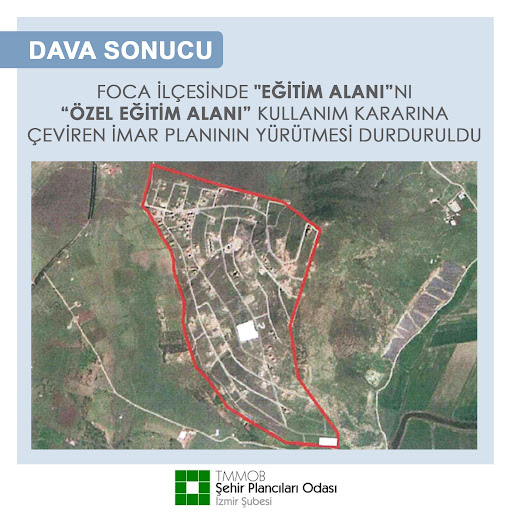 Yapılan açıklamada, planlarının şehircilik ilkelerine uymadığını ve kamu yararına aykırı olduğu vurgulanarak, “İzmir Büyükşehir Belediye Meclisinin 10.02.2020 tarih ve 05.154 sayılı kararı ile uygun görülerek Başkanlık Makamınca 23.03.2020 tarihinde onanan İzmir İli, Foça İlçesi, Bağarası Mahallesi, 349 ada 1 parsel ve 325 ada 1 parsele ilişkin NİP-36655,2 plan işlem numaralı 1/5000 ölçekli Nazım İmar Planı değişikliği ile “Eğitim Alanı”nın “Özel Eğitim Alanı”na, “İdari Tesis Alanı”nın eş değer yeni bir alan ayrılmadan “Belediye Hizmet Alanı” kullanım kararına dönüştürülmesinin şehircilik ilkeleri, planlama esasları ve kamu yararına aykırı olması nedeniyle yürütmesinin durdurulması ve iptali talebiyle Şubemizce İzmir 6. İdare Mahkemesi’nin 2020/1231 Esas sayılı dosyası ile açılan dava sonucunda hazırlanan bilirkişi raporunda yer alan hususlar dikkate alınarak, Mahkemenin 16.06.2021 tarihli kararı ile söz konusu plan değişikliğinin yürütmesi durdurulmuş, ardından 29.09.2021 tarih, 2021/1467 sayılı kararı ile de iptal edilmiştir” ifadelerine yer verildi.