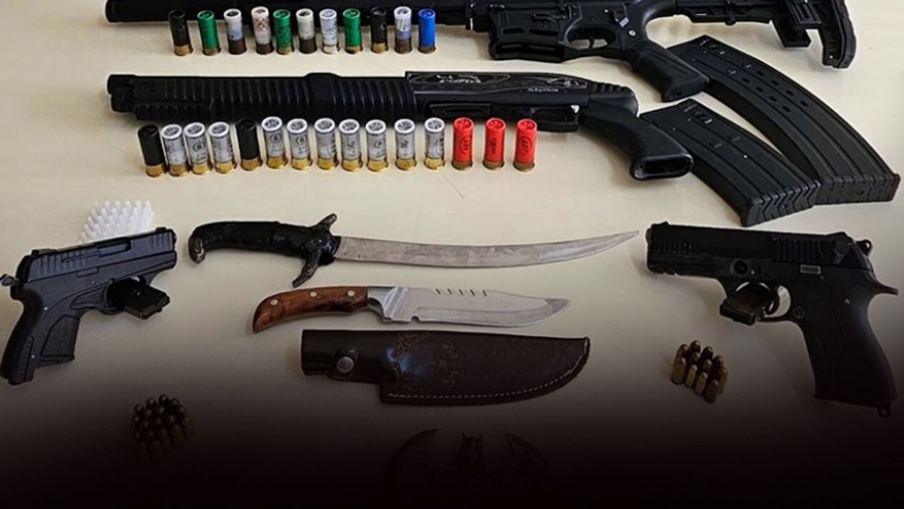 Yapılan aramalarda 2 otomatik ruhsatsız tüfek, 2 ruhsatsız tabanca, 51 adet mermi, 2 bıçak ve bir muşta ele geçirildi.