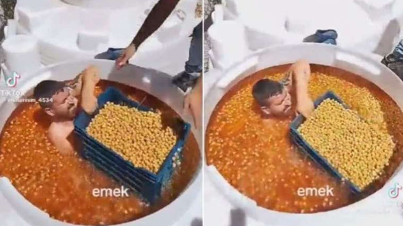 Sosyal medya platformu TikTok'ta bir kişinin yeşil zeytin tankının içine girerek kendisine verilen boş sepetleri doldurduğu görüntüler büyük tepki topladı.