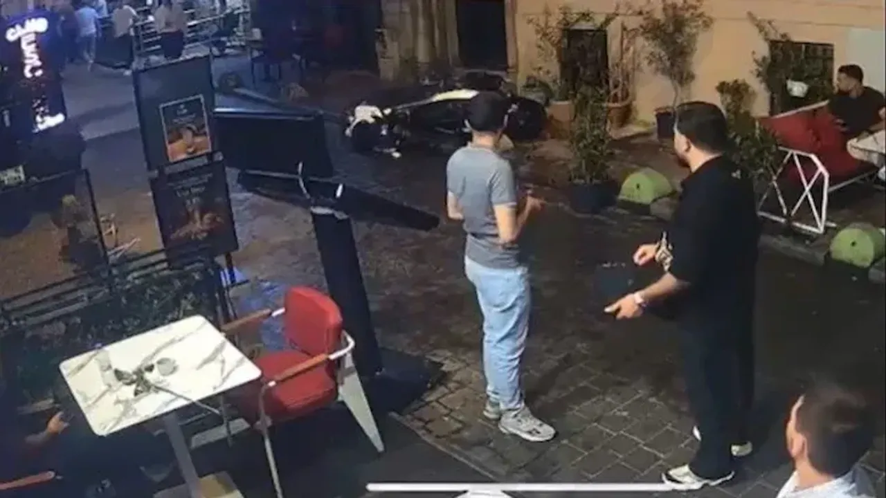 Kısa süre sonra binada oturan bir kişi, kapıyı kapatan motosiklete tepki gösterdi. Üst kattan aşağıya çorba döken kişi, daha sonra sokağa inerek motosikleti tekmeledi ve yere düşürdü.