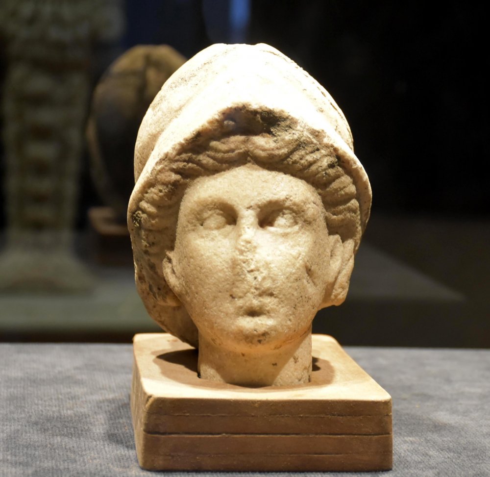 "Tanrıça Athena'nın miğfer takmış bir heykelinin baş kısmı. Athena, erken dönemde evin ve hanenin daim olmasıyla ilgili bir görevi var. Sanatı ve ilhamı da temsil eder. Esasen savaş ve barışın tanrıçası. Kentlerin yükseldiği Helen dünyasında, adıyla kentinin bulunduğu bir tanrıça. Kente dair her şeyi haliyle barışı ve savaşı, adil olan bir mücadeleyi temsil ediyor. Bu mermer baş 1995 yılında bulundu. Geliş yerini bilmiyoruz, bize farklı yollardan ulaşmış. Geldiğinden bu yana depodaydı, ilk kez sergilenmeye başlandı. Athena'nın savaşçı ruhundan ötürü başında genelde miğferle temsil eder. Güzel bir kadın ve saçı toplu. Orta ölçekte bir heykelin başı olması muhtemel. Genelde elinde bir kalkan ve mızrak olur. Tanrıça genelde kenti korur. Tapınaklarda yer alır. Kendi adına düzenlenen festivallerle onurlandırır. Atletik olimpiyat gösterilerin olduğu festivallerde bu eserler ödül olarak da verilebilir. Helenistik döneme ait 2 bin 300 yıllık bir eser. Ziyaretçiler müzedeki eserlere ilgi gösteriyor." (DHA)