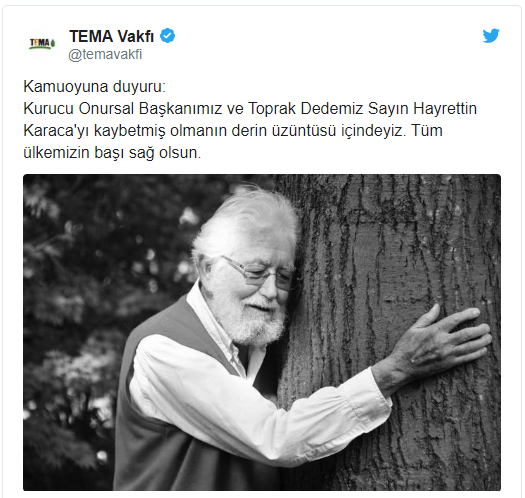TEMA Vakfı'ndan yapılan açıklamada, "Kurucu onursal başkanımız ve Toprak Dedemiz Sayın Hayrettin Karaca'yı kaybetmiş olmanın derin üzüntüsü içindeyiz" denildi.