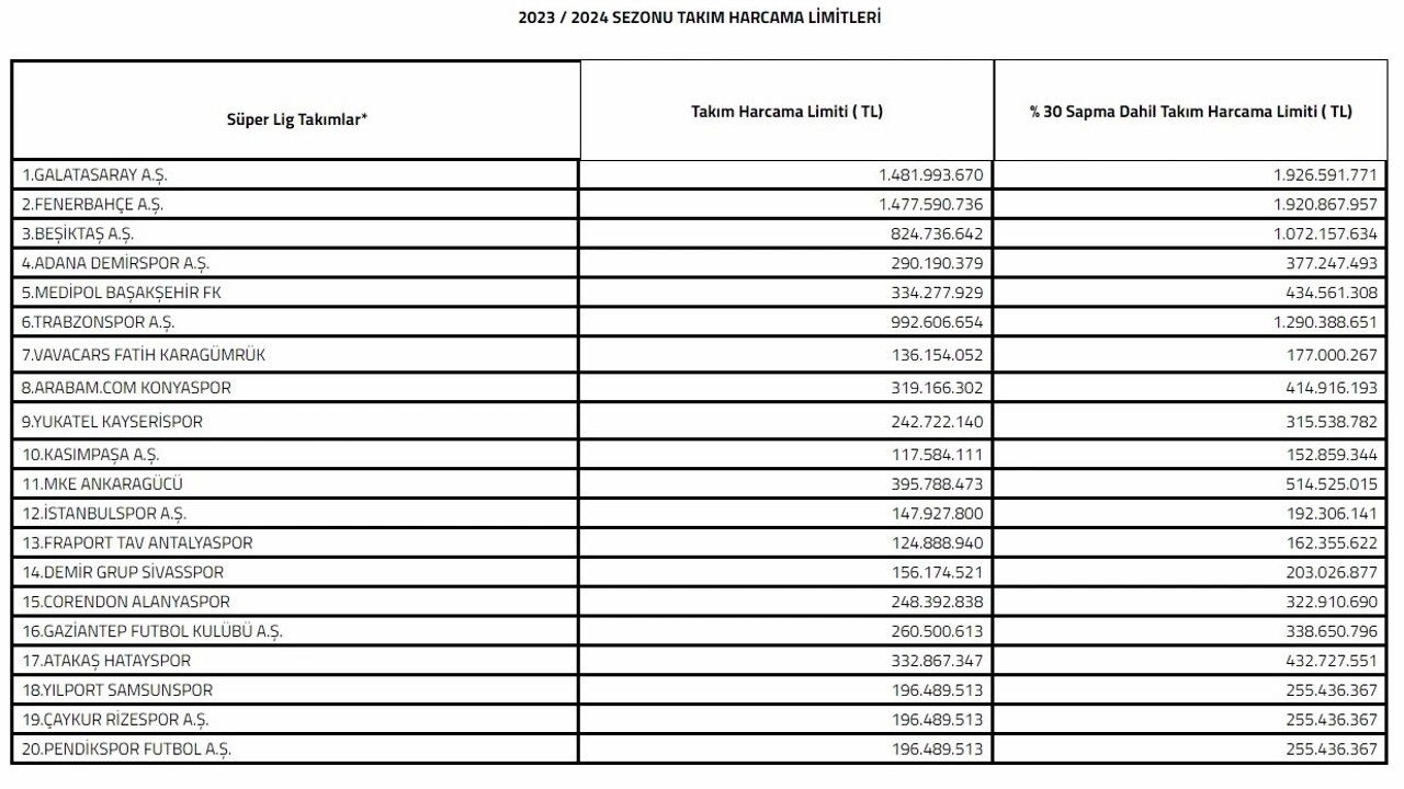 Öte yandan ligin yeni ekipleri Samsunspor, Çaykur Rizespor ve Pendikspor'un harcama limitleri ise 255 milyon 436 bin TL.