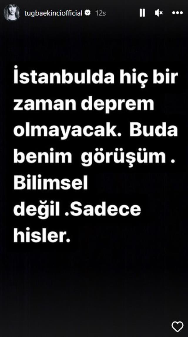Uzman isimlerin aksine "Bilimsel değil, sadece hisler" diyerek paylaşım yapan Tuğba Ekinci, İstanbul'da hiçbir zaman deprem olmayacağını söyledi. "Bu da benim görüşüm" diyen Ekinci, bu açıklamasıyla sosyal medyada alay konusu oldu.