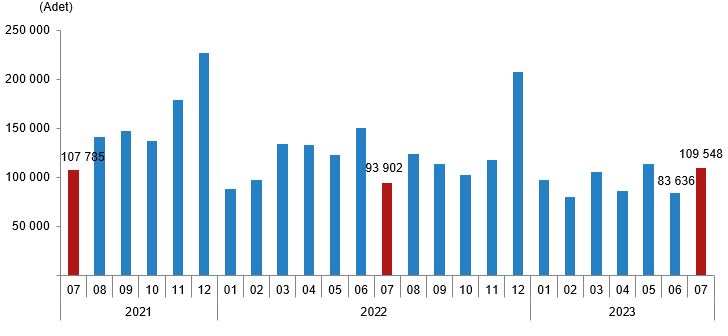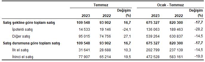 Türkiye genelinde konut satışları Temmuz ayında bir önceki yılın aynı ayına göre %16,7 artarak 109 bin 548 oldu. Konut satışlarında İstanbul 15 bin 724 konut satışı ve %14,4 ile en yüksek paya sahip oldu. Satış sayılarına göre İstanbul'u 9 bin 688 konut satışı ve %8,8 pay ile Ankara, 5 bin 203 konut satışı ve %4,7 pay ile İzmir izledi. Konut satış sayısının en az olduğu iller sırasıyla 27 konut ile Ardahan, 40 konut ile Hakkâri, 91 konut ile Tunceli oldu.