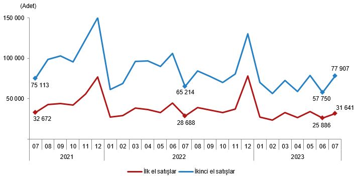 Türkiye genelinde ikinci el konut satışları Temmuz ayında bir önceki yılın aynı ayına göre %19,5 artış göstererek 77 bin 907 oldu. Toplam konut satışları içinde ikinci el konut satışının payı %71,1 oldu. İkinci el konut satışları Ocak-Temmuz döneminde ise bir önceki yılın aynı dönemine göre %19,0 azalışla 472 bin 528 olarak gerçekleşti.