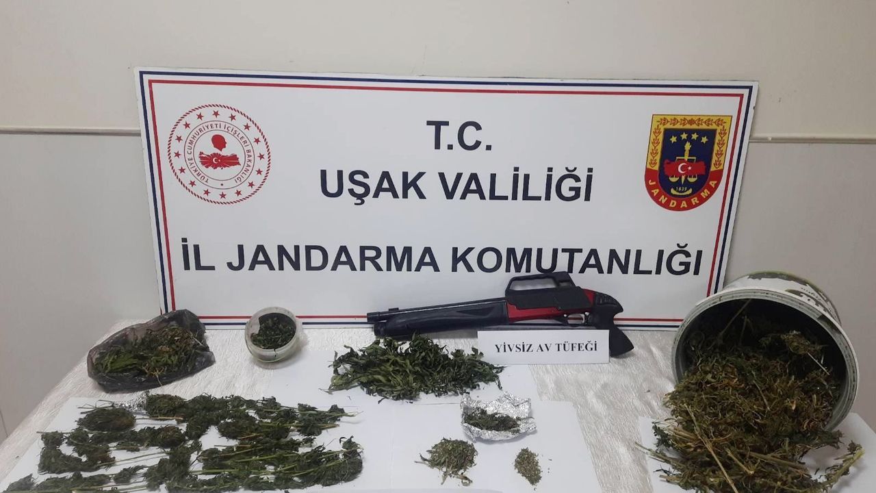 Adreslerde yapılana aramada, 828 gram esrar, 1 ruhsatsız av tüfeği ve uyuşturucu aparatları ele geçirildi.