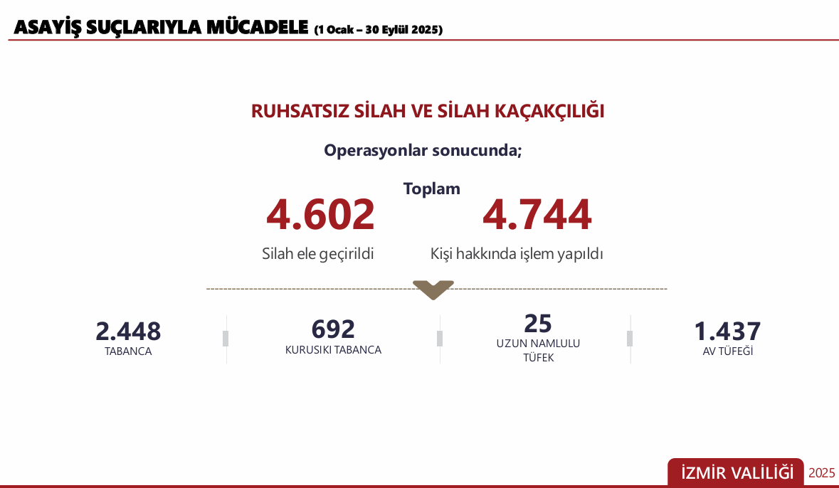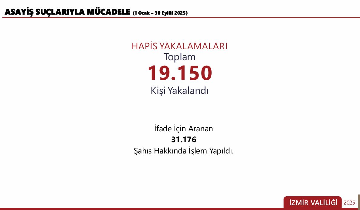 Hale YILDIRIM / GÜNDEME BAKIŞ - İzmir Valisi Süleyman Elban, beraberindeki kolluk kuvvetleri amirleriyle birlikte, 1 Ocak – 30 Eylül dönemini kapsayan 9 aylık asayiş ve güvenlik verilerini paylaştı. Valilik Toplantı Salonunda yapılan toplantıda Vali Elban, bu yıl suç işleme oranının geçen yıla göre daha düşük olduğunu kaydetti.