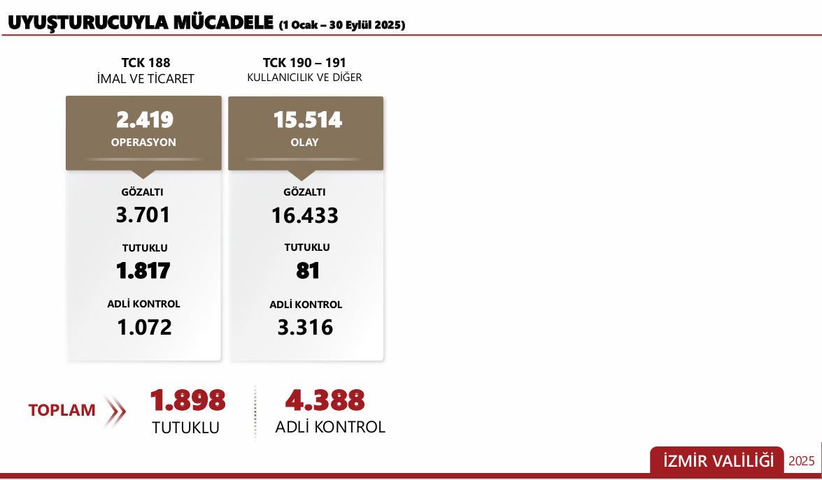 Uyuşturucuyla mücadelemiz devam ediyor, imal ve ticaretine yönelik 3 bin 701 kişi gözaltına alınmış, kullanıcılık olarak da 15 bin 514 olay meydana gelmiş, 16 bin 433 kişi gözaltına alındı. En çok ve en sıkı denetlendiğimiz alanlar okul civarları, en ufak fırsat ya da tolerans söz konusu olamaz.