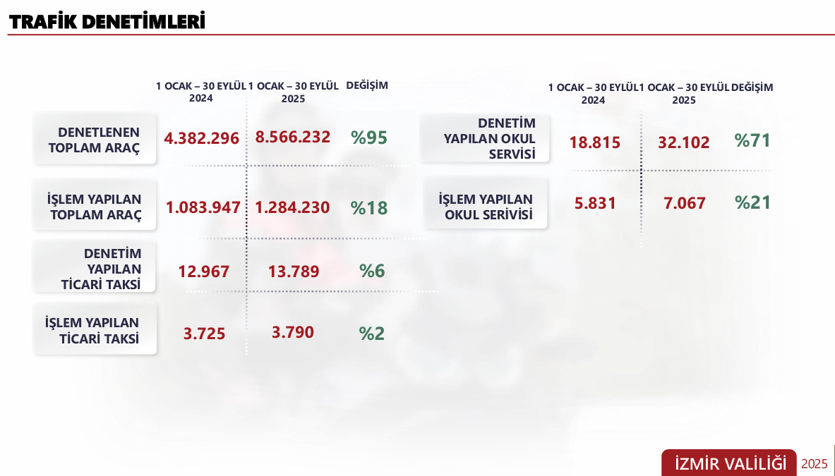 Trafikle ilgili denetimlerimiz devam ediyor, 8 milyon 566 bin adet denetlenmiş, geçen yıl 4 milyon 382 bindi. Yüzde 95’lik artış söz konusu denetlemede. Bunlardan 1 milyon 1284 bin araca işlem yapılmış. Ticari taksilerde 13 bin 789 takside denetim yapılmış. Okullardaki servis araçlarının denetimi çalışmalarında artışlarımız söz konusu. 32 bin 102 servis aracı denetimi yapılmış, 7 bin 67’sine işlem yapılmış.