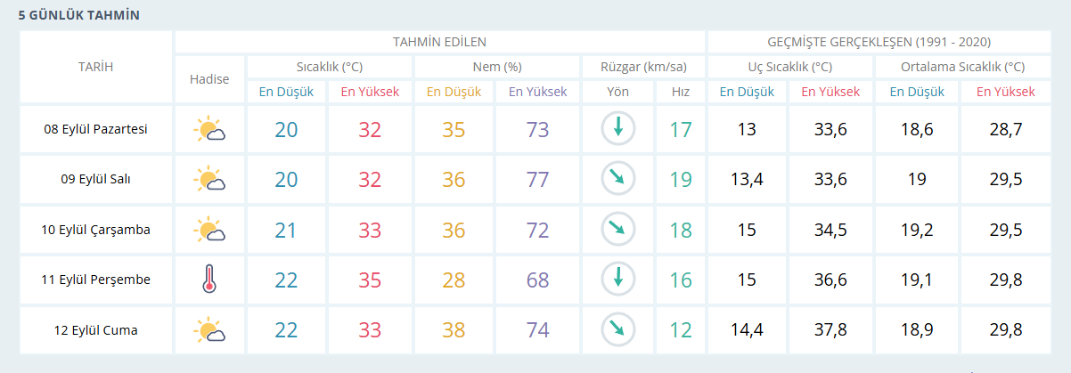 Pazartesi ve Salı günü 32 derece civarında seyredecek hava sıcaklığı, Çarşamba günü 33 dereceye, Perşembe günü ise 35 dereceye kadar yükselecek. Hafta sonuna yaklaşırken Cuma günü sıcaklık yeniden 33 dereceye düşecek. Özellikle Tire, Beydağ ve Ödemiş gibi iç kesimlerde ise termometrelerin 38 dereceyi bulması bekleniyor. Kent merkezinde sıcaklıkların 33-34 derece bandında seyredeceği bildirildi.