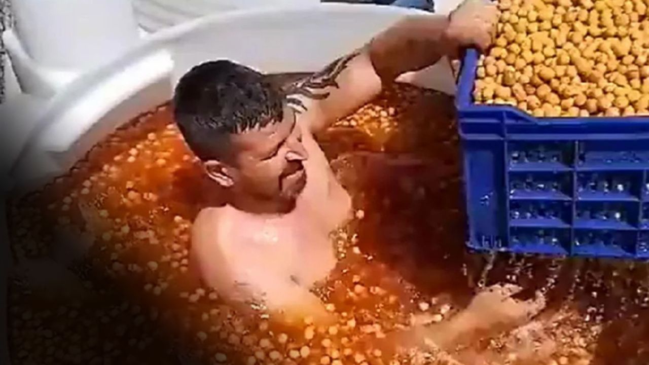 Manisa'da bir çalışanın yeşil zeytin tankının içine çıplak bir şekilde girerek kendisine verilen boş sepetleri doldurduğu anlar sosyal medyadan paylaşıldı.
